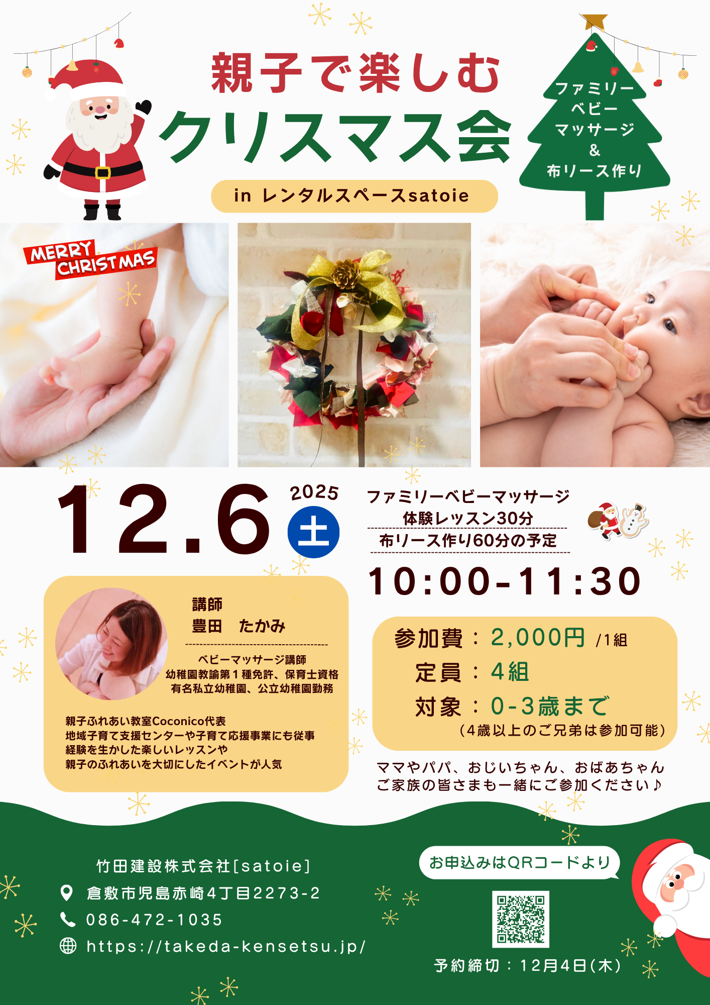 経験豊富な講師によるベビーキッズマッサージの体験レッスンと、この時期にピッタリのクリスマス用リースを作ります。