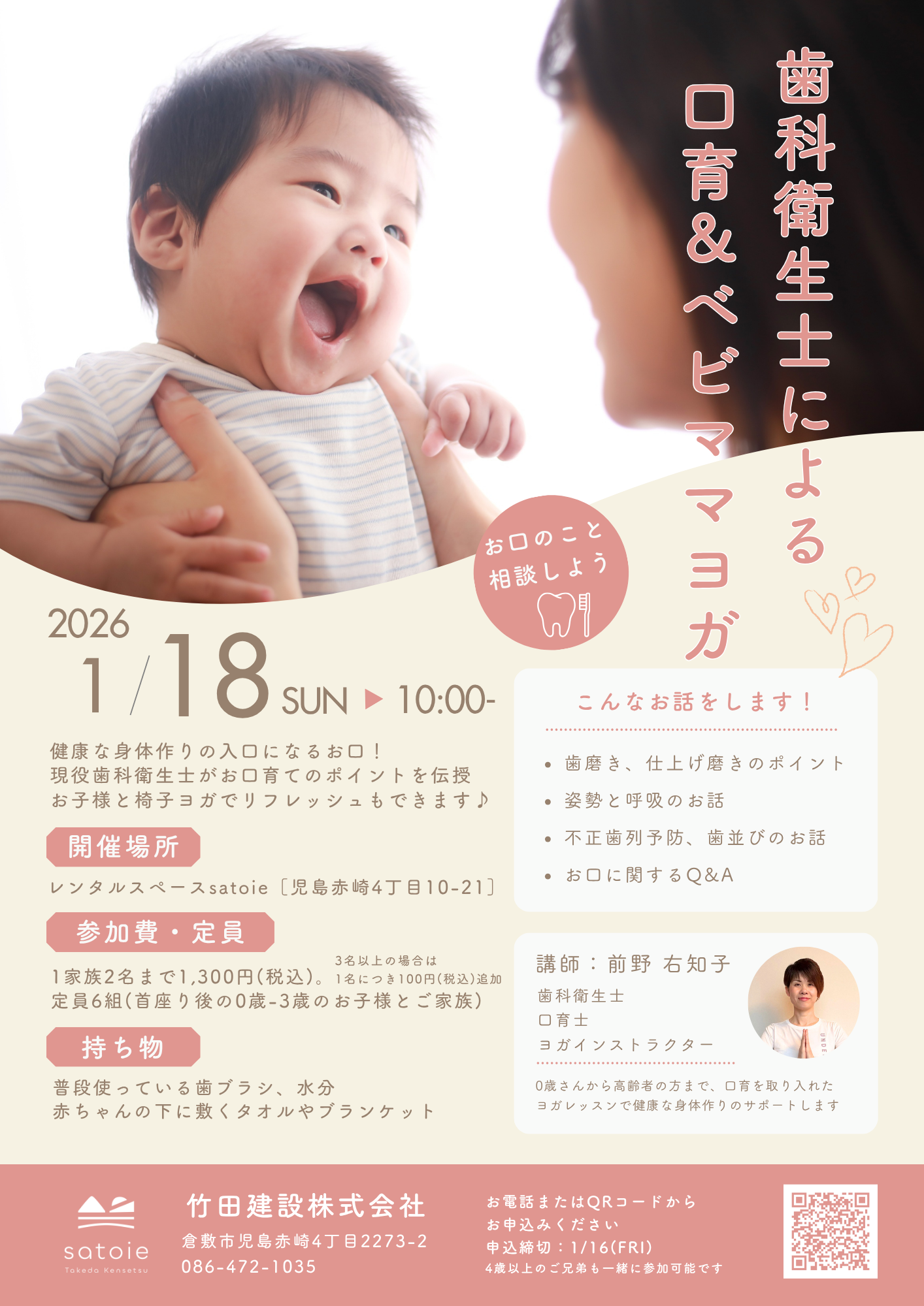 0から3歳のお子さまとご家族向けの口育とベビママヨガのイベントです。