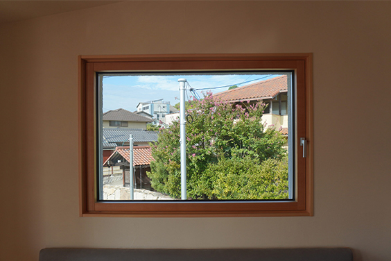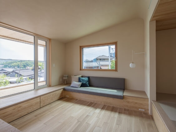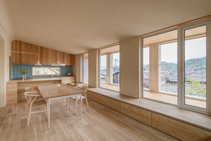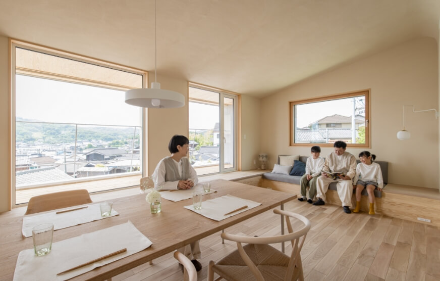 高台の眺望を取り入れるために、プライベートを守る配置計画やブラインドを工夫して、開放的な二階リビングを設計しました。東西南北、どこに居ても・どこを向いても窓があり、瀬戸内海や鷲羽山などそれぞれ眺望を借景して楽しむことができます。また、将来は一階で間取り変更して暮らすことができる構造計画を組み、住まい手の変化に合わせた長く住まえる家がどんなものなのかを見学いただけます。