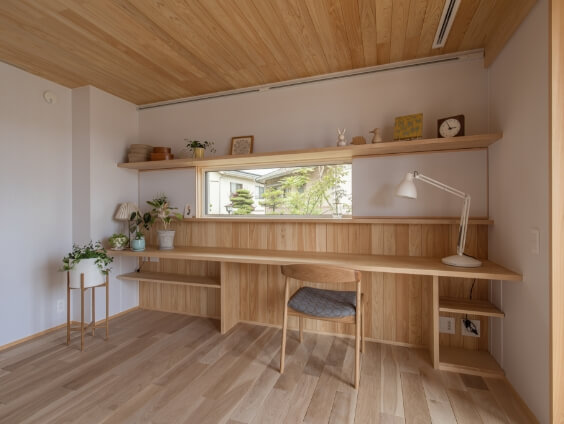 見晴らしの家の性能は、断熱性を表すUA値は0.26W/(㎡・K)、気密性を表すC値は0.20㎠/㎡で、年間の暖房需要は14.07kWh/㎡で、冷房需要は22.27kWh/㎡です。年間にかかる光熱費は月平均1万円ほどですが、太陽光(7.28kw)を運用するとより抑えるられることになります。超断熱と第一種換気・全館空調によって室温・湿度の不快さはなく、自然素材(無垢床や板張り仕上げ、珪藻土等)で空気はより心地よく、触れ心地も相まって言葉にしようのない落ち着きがあります。