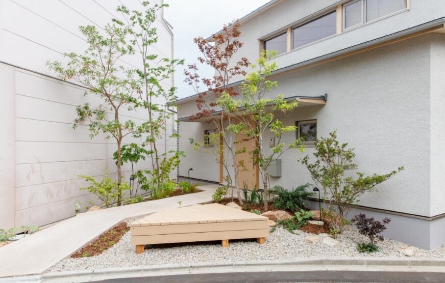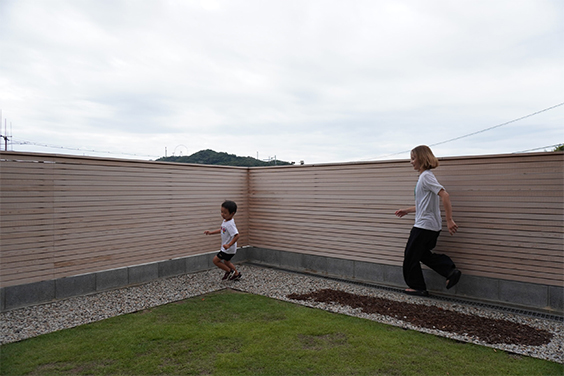 見晴らしの家は、建物を敷地に対して斜めに配置し、周囲の景観や見晴らしの良い真南の方角へ向けています。そうすることで生まれる4つの庭それぞれに名前をつけて、暮らしを彩っています。庭のある暮らしが、住まいの中と外、その中間層にいる時にどう影響するのかを実体験していただきたいと思っています。四季折々の変化を楽しみながら、景色と共に暮らす心地よさをぜひご体感くださいませ。