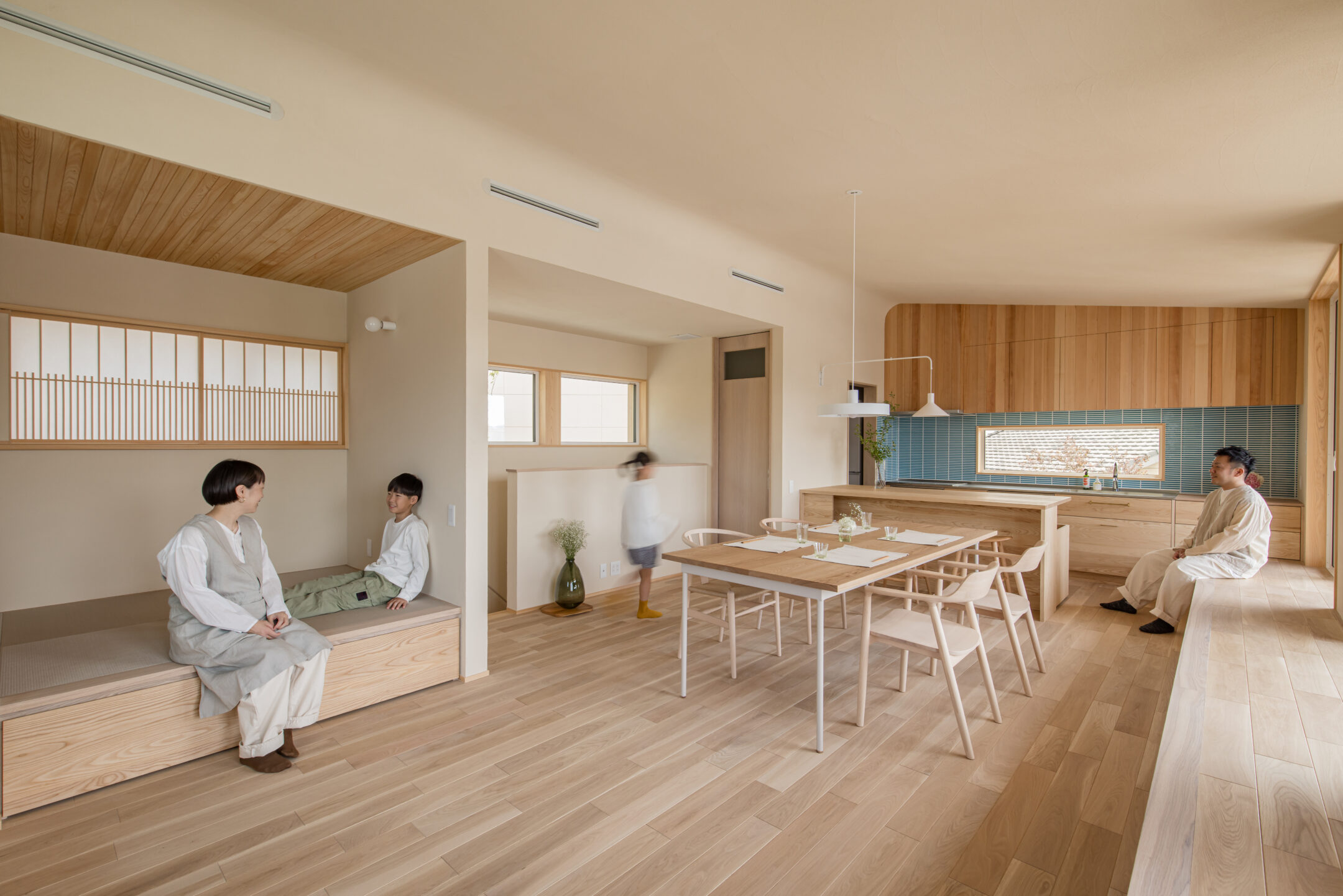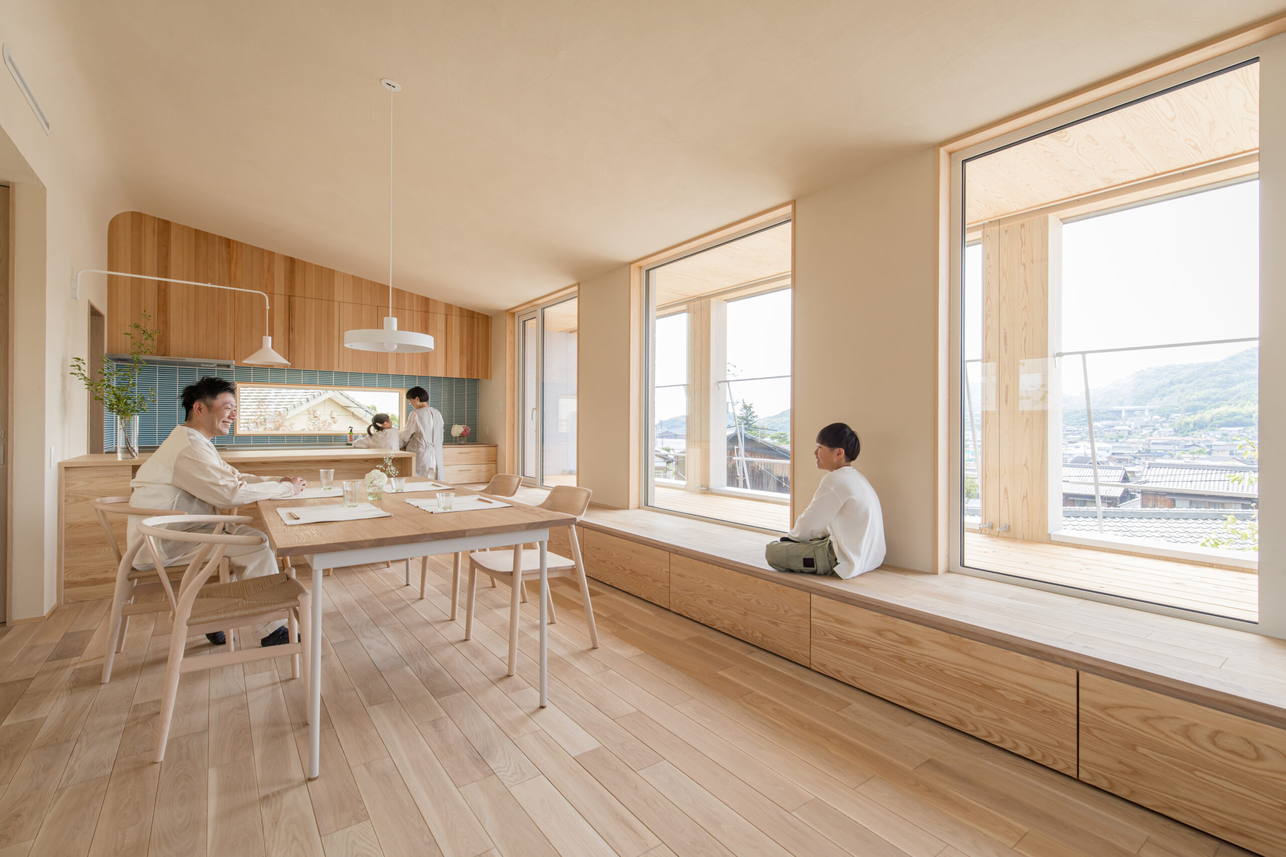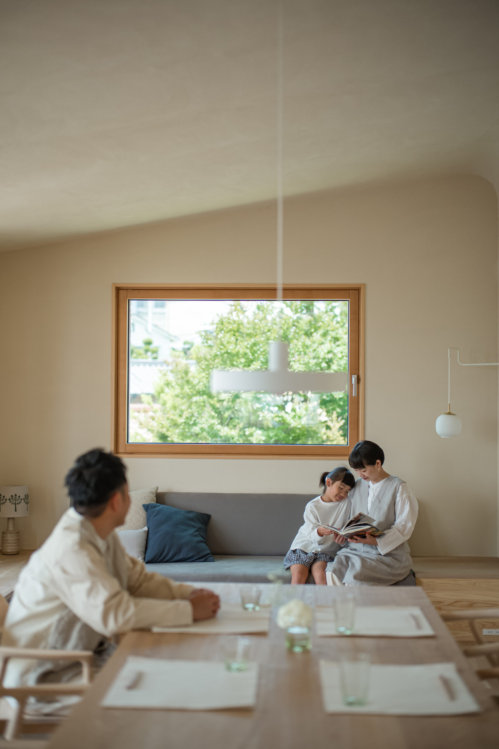 家族が思い思いの場所に腰をかけ、会話を愉しんだり窓からの景色に癒されたり。