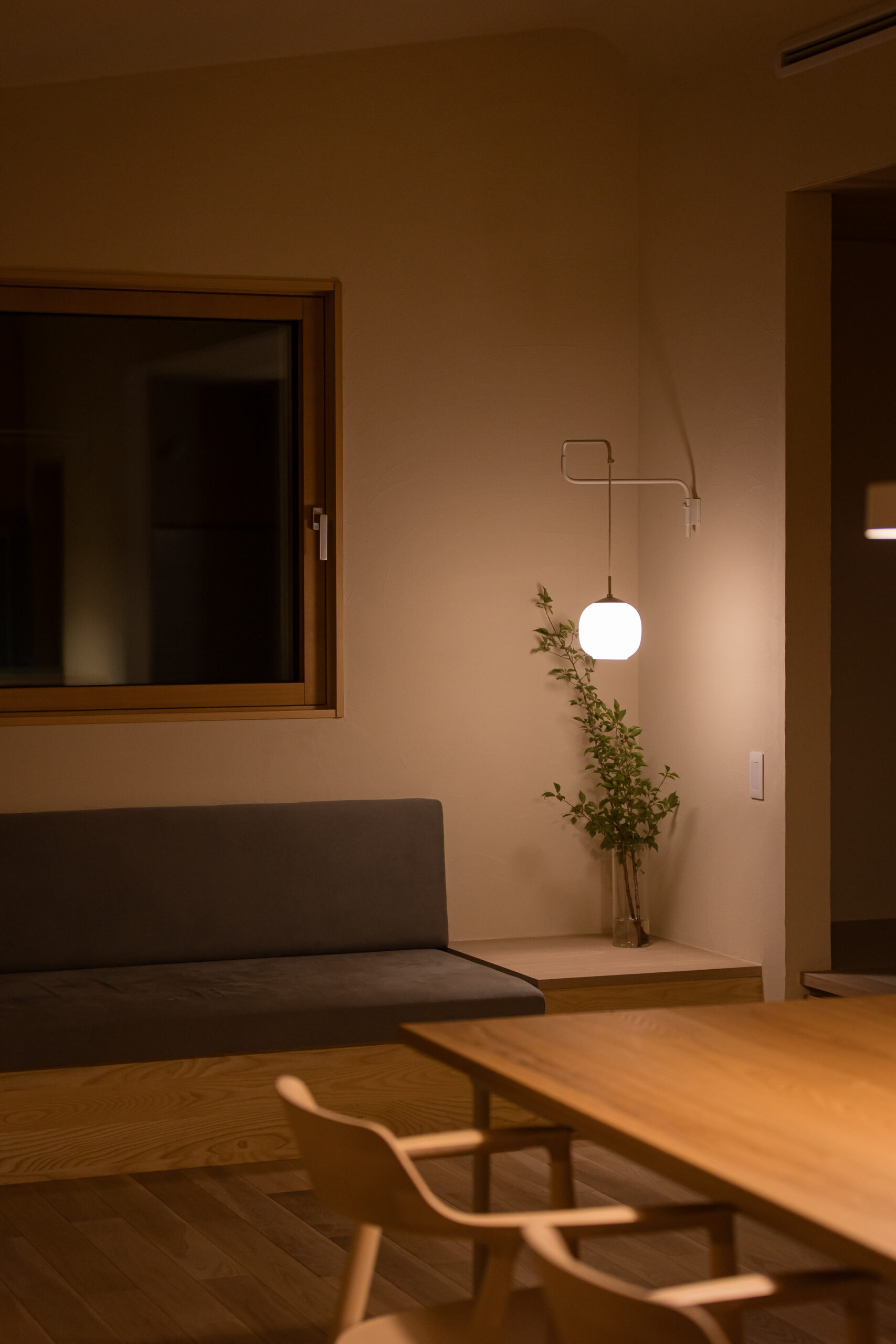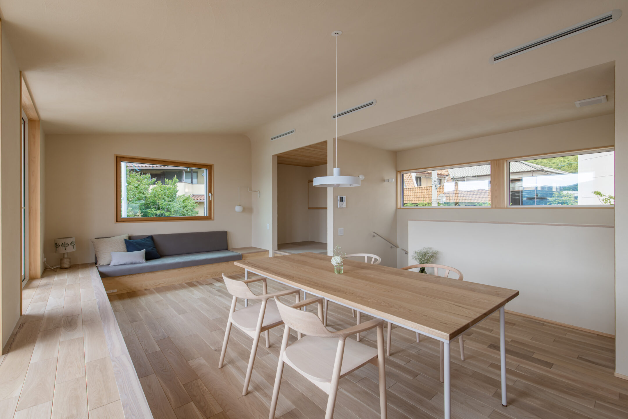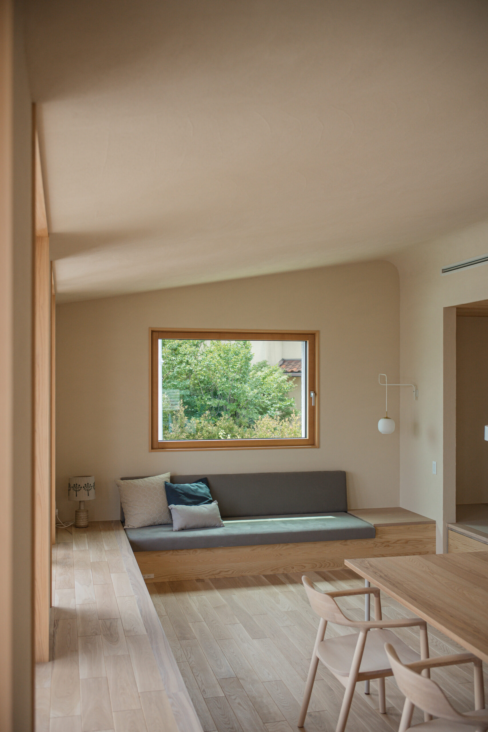 窓辺にあるベンチや小上がりの和室、造作のソファ。