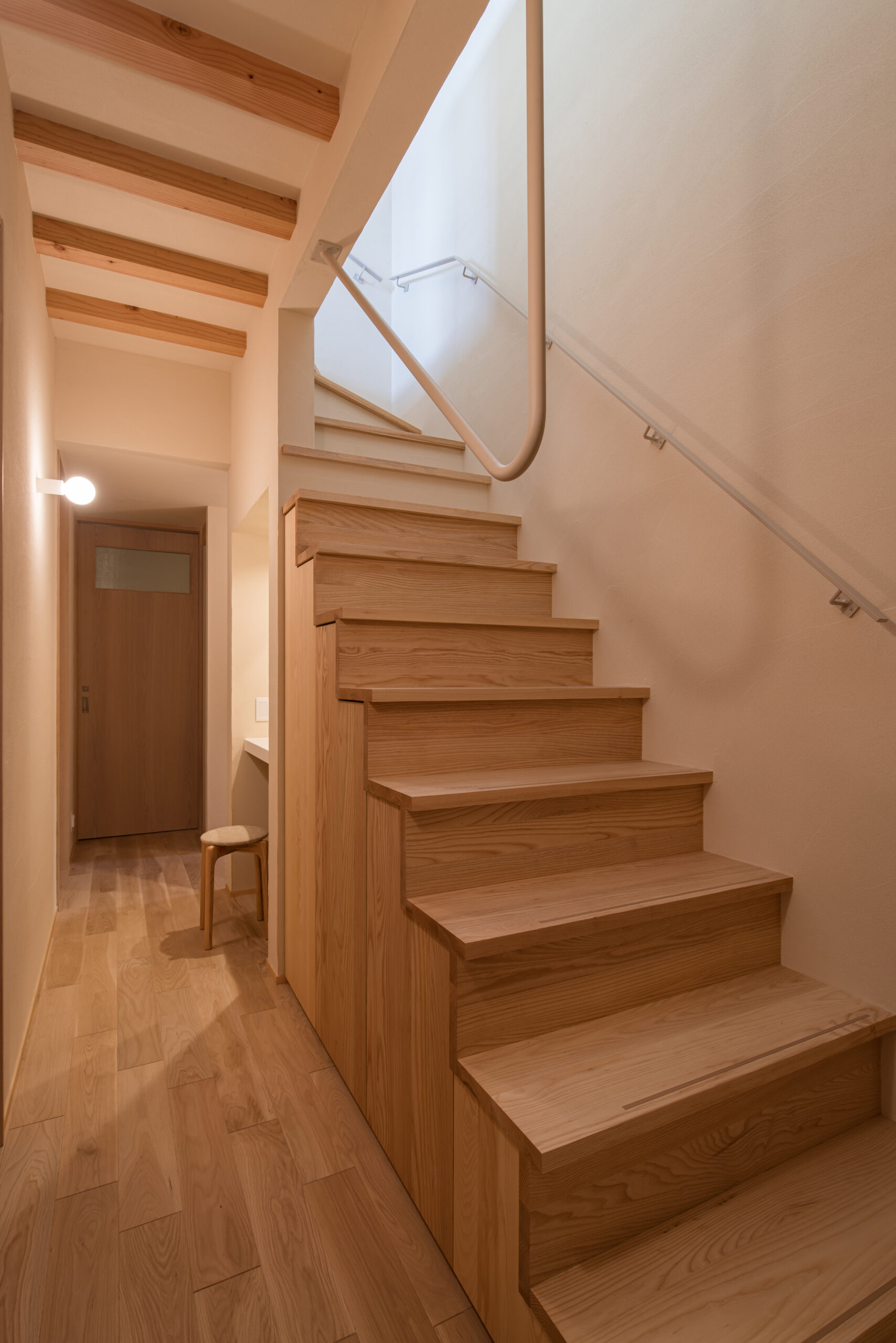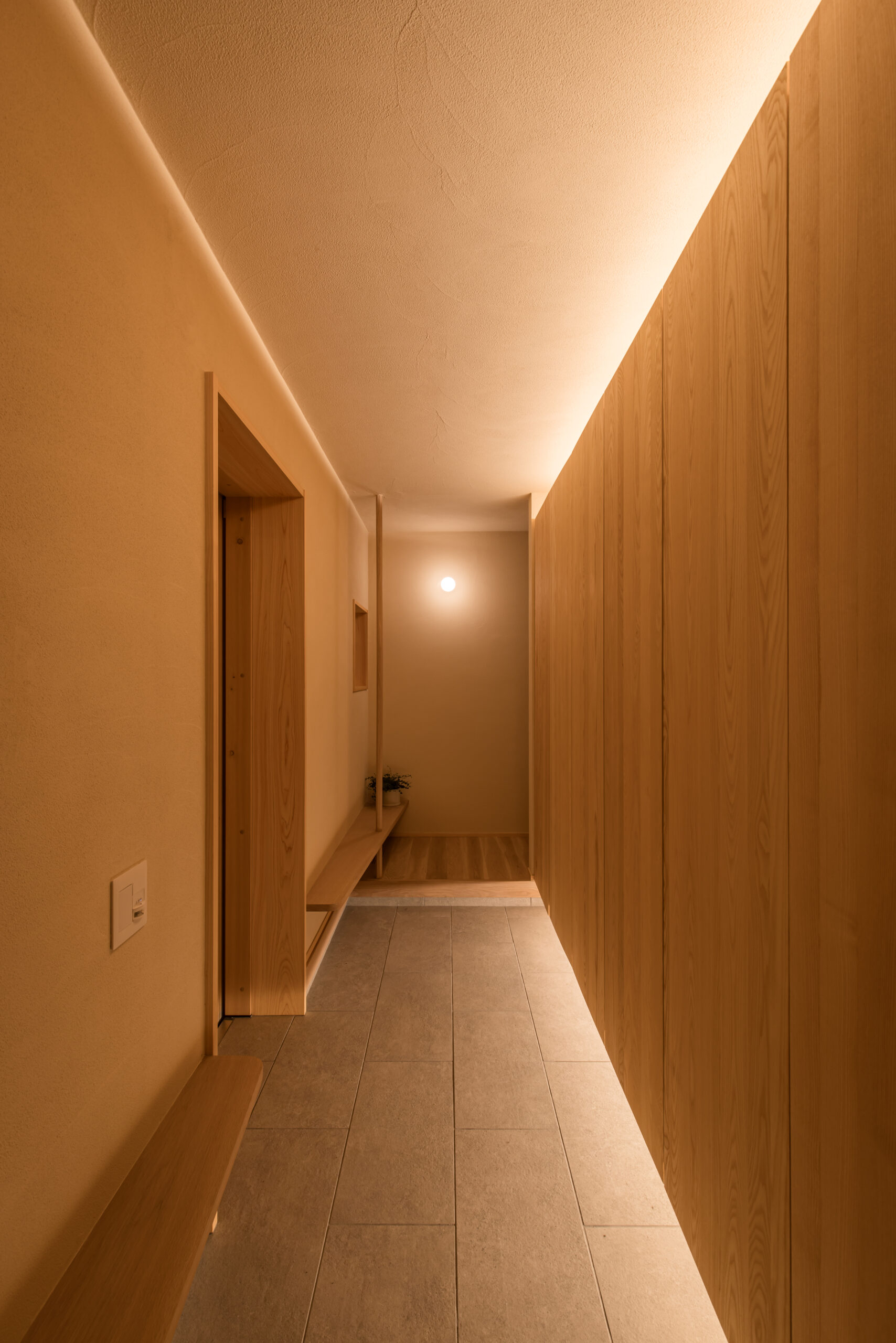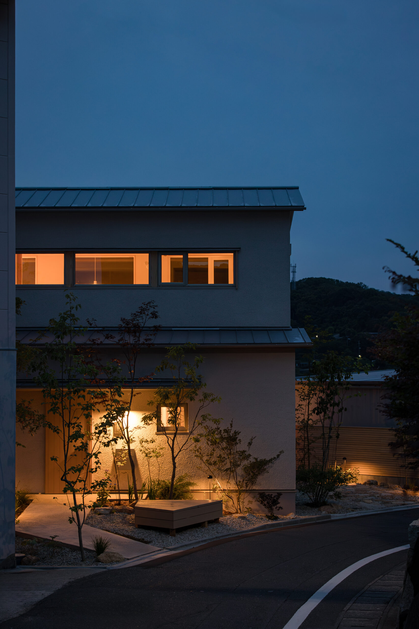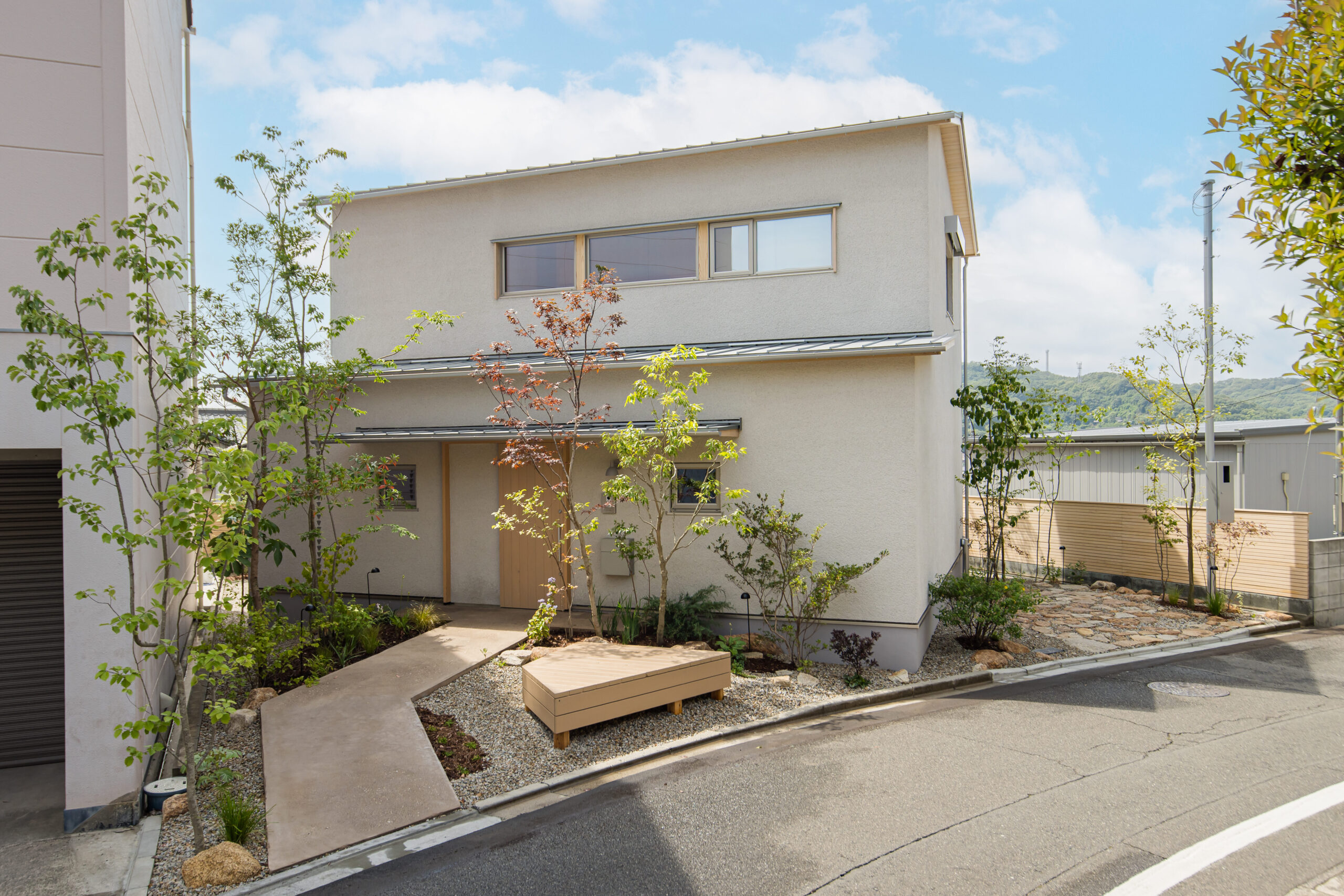 玄関先には街の人が誰でも座れるベンチを設け、個人と地域の境界を敢えて曖昧にしています。