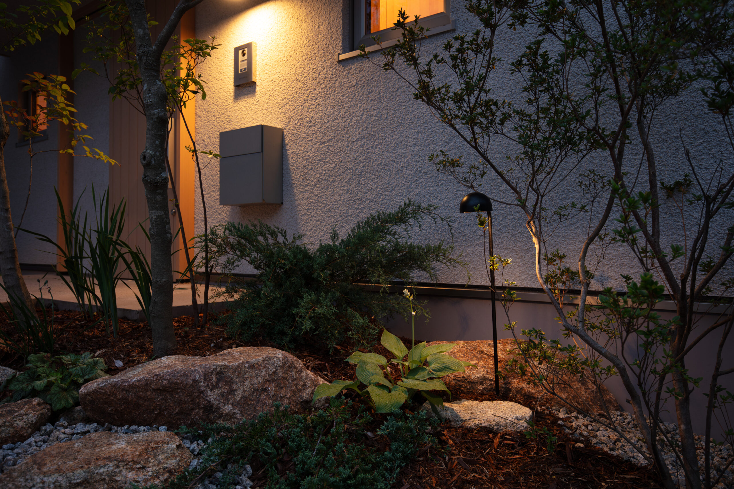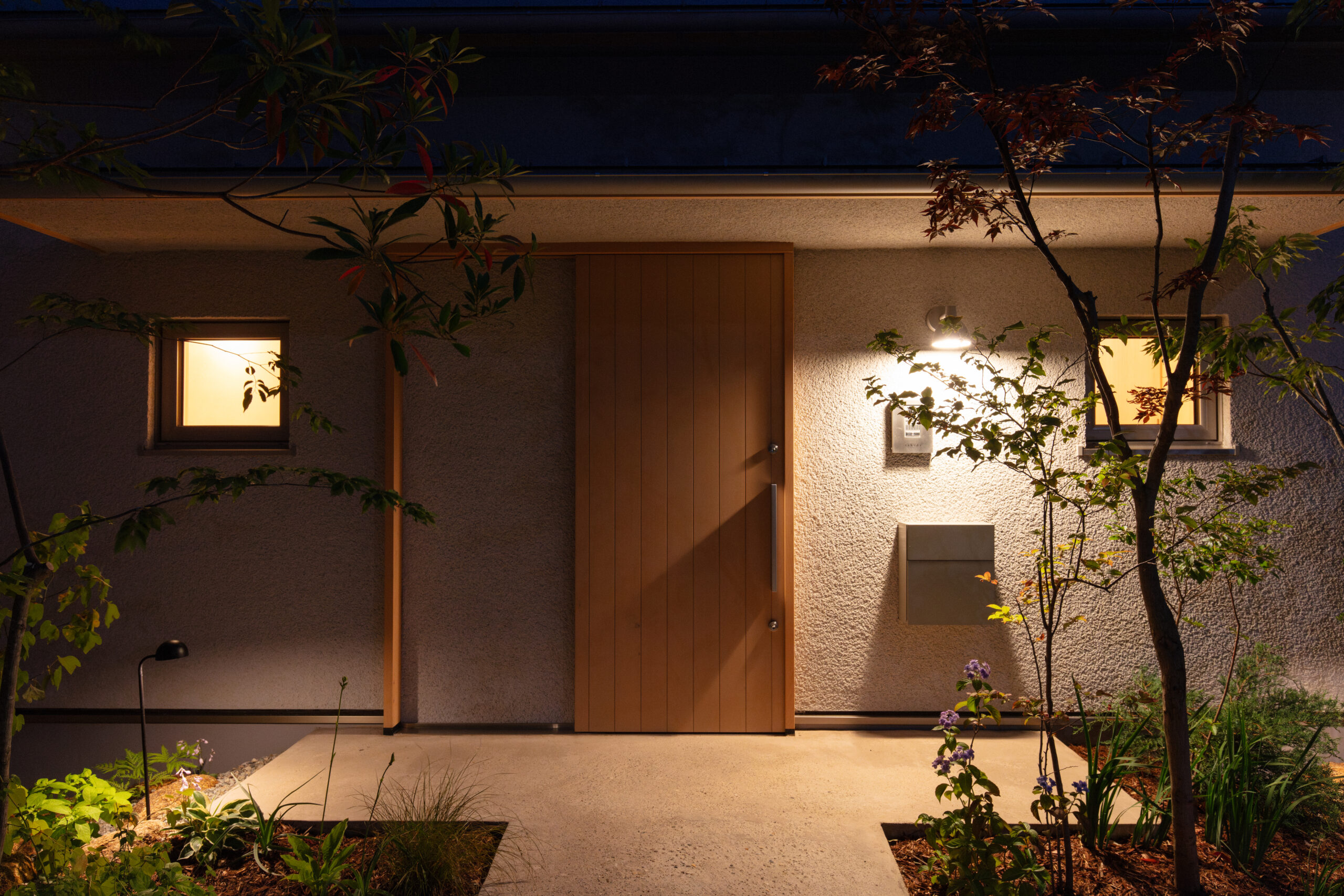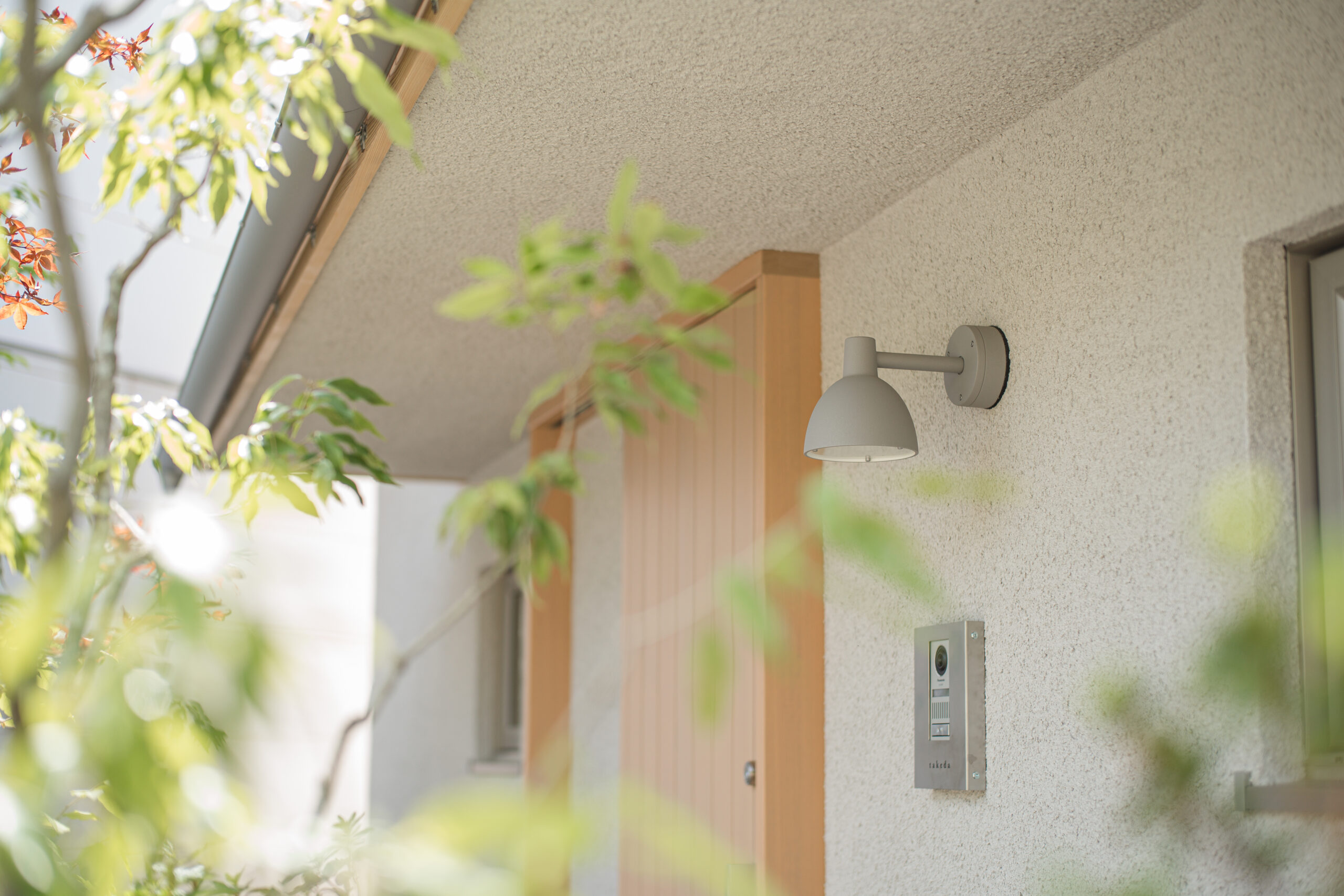 凹凸のあるそとん壁で仕上げた外壁は光が当たると柔らかな陰影が生まれ、庭の木々や自然豊かな街並みに調和します。